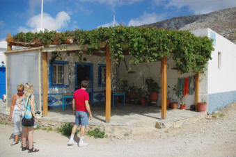 Avlona is een afgelegen plaatsje waar niet veel toeristen komen. De meesten komen met een excursie naar Olympos met de bus en gaan 's-avonds weer terug naar Diafani. Toen wij er aankwamen was het dan ook vrijwel uitgestorven.Het dorpje Avlona ligt 8 km van Olympos in een vallei en bestaat uit zo'n 300 huizen die tegen de berghelling zijn gebouwd. Enkele huizen zijn maar bewoond, de rest vroeger alleen tijdens de oogsttijd.De kavels zijn ommuurd en ook zie je hier veel betonnen cirkels liggen binnen de muren. Hierop wordt in de maand juni het graan gedorst.Er is zelfs een kafenion. Toen wij kwamen zat er een oude man van 96 jaar. Omdat er bezoek kwam, dat was iets bijzonders blijkbaar, trakteerde hij zichzelf op een koel blikje Heineken. Hij liep nog geregeld, met behulp van 2 stokken naar Olympos op en neer.Hij vertelde zelfs dat hij in zijn jonge jaren nog te voet naar Pigadia ging. Hij was dan enkele dagen onderweg. Op een avond, toen het hard regende had hij geen slaapplaats en heeft toen de nacht doorgebracht in een van de broodovens die nog warm was.Het oude echtpaar deelde zelfs hun lunch met ons, zo gastvrij!