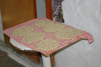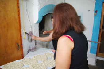Toen we een kennis gingen opzoeken in Menetes was het die dag toevallig de wekelijkse broodbakdag (*) van haar familie. Enkele vrouwen waren deeg aan het rollen op een tafelblad waarna op een rond plankje de rolletjes deeg in een patroon gelegd werden. Dit werk wordt alleen door de vrouwen gedaan. Buiten was een oude man met een stok, met daarom heen gevouwen bladeren, de broodoven aan het aanmaken.