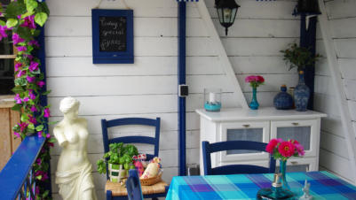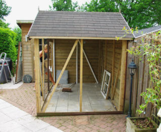In onze tuin stond nog een tuinhuisje dat eigenlijk overbodig geworden was. We kwamen op het idee om daar een Griekse mini-taverne van te maken. Juni 2010 zijn we begonnen met de ontmanteling van de buitenzijden. Het huisje moest daarna nog wel hier en daar verstevigd worden en de constructie aangepast om niet bij de eerste de beste storm weg te waaien. Met de hulp van een timmerman is dat helemaal goed gekomen. De rest hebben we helemaal zelf gedaan. De meeste tijd is in het schilderwerk gaan zitten. Tussendoor zijn we ook nog even 2 weken naar Karpathos geweest maar in juli hebben we het zover af gekregen dat we er gebruik van kunnen maken. Update augustus 2021: na lange dienst is de taverne afgebroken om plaats te maken voor een nieuwe tuin.Hieronder een impressie van de werkzaamheden destijds en het uiteindelijke resultaat. We hebben er veel uren plezier van gehad.