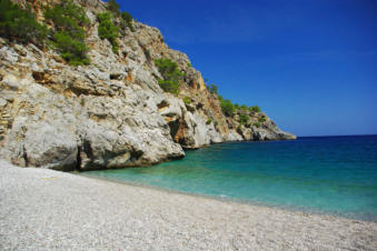 Achata vind je wanneer je noordelijk rijdt langs de oostkust. Bij het plaatsje Aperi houd je rechts aan. Je komt het bord Achata vanzelf tegen.Wanneer je hier bent valt het gewoon op hoe stil het hier is. Geen muziek of geschreeuw. Alleen de wind hoor je. Bij deze baai vind je aan de linkerzijde een taverne waar je wat kunt drinken of een hapje eten. Er zijn strandbedjes met parasol te huur maar die zijn er lang niet genoeg. Op tijd daar zijn dus. In het hoogseizoen kan het wel drukker zijn.In de nabijheid is een grot met stalactieten en stalagmieten die alleen te vinden zijn onder begeleiding van een gids.
