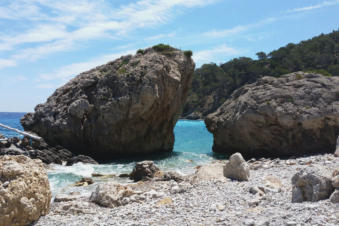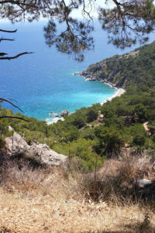 Een van de boten die in de haven van Pigadia liggen, de Love-boat, vaart elke dag naar 3 baaien : Achata, Kato Lako en Kyra Panagia. Daarna vaart hij door naar Kato Lako welke we na een half uurtje varen bereiken. Over een gammel loopbruggetje gemaakt van palen en oude pallets, bereik je het strand. De boot blijft er ongeveer 2 1/2 uur liggen. Intussen maakt de bemanning de lunch klaar: souvlaki met brood en salade. Een mooi schaduwplekje onder de bomen moet als taverne doorgaan.Snorkelen heeft hier geen zin, veel golfslag en een grote grindbak onder water.
