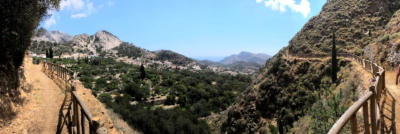 Loop je het pad weer terug naar beneden dan zie je op een gegeven moment midden tussen de moestuinen een kapellteje liggen met de Griekse vlag geschilderd op de gevel. Net daarvoor troffen we een totaal verwilderde tuin aan bedolven door een woekerende plant met schitterende bloemen. Zo te zien had al tijden niemand hier nog gelopen. Heel bijzonder.